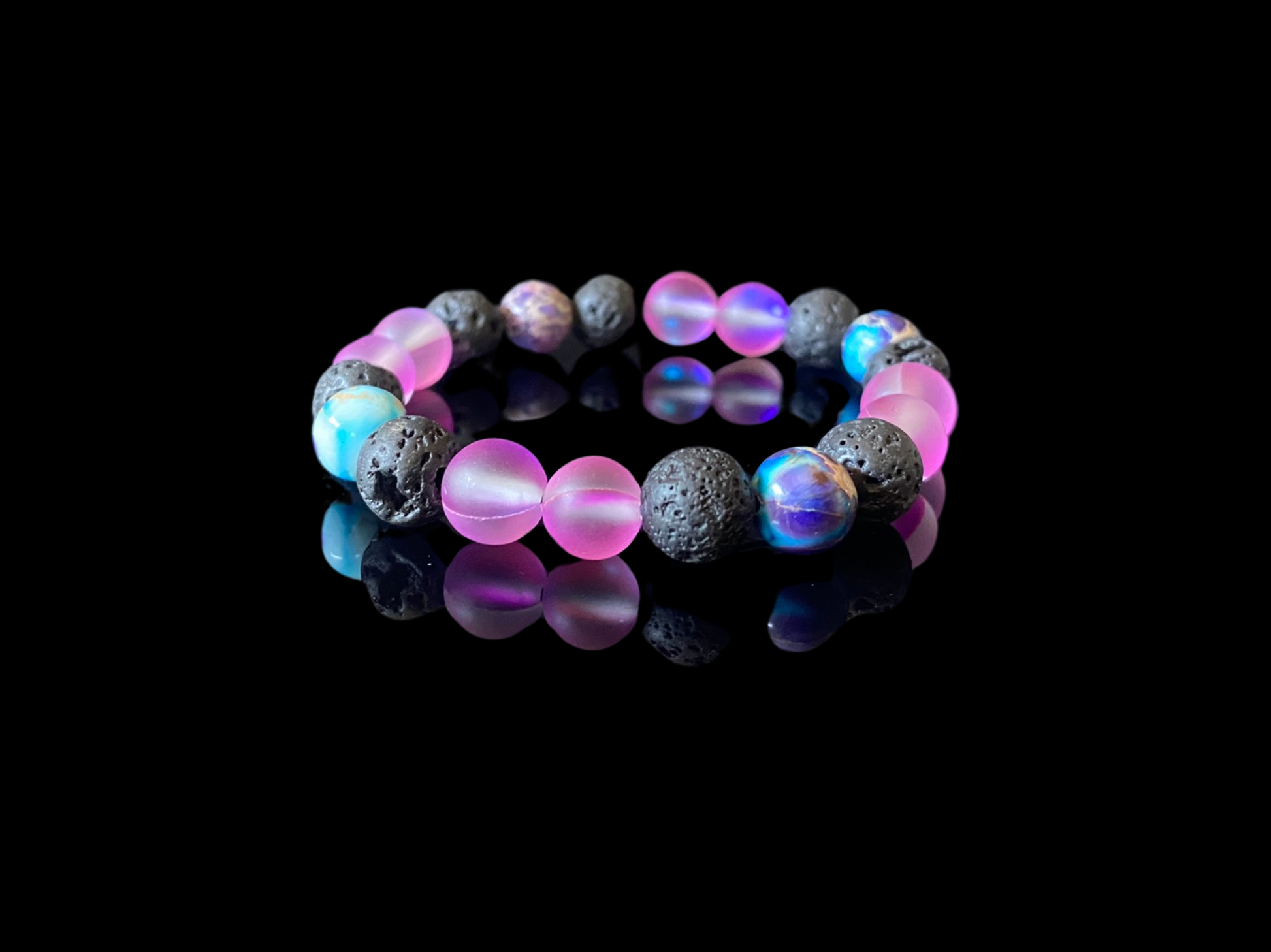 In addition to the 8mm Lava Stone beads, this bracelet features 8mm purply-mermaid colored glass moonstone beads with a frosted matte finish, and 8mm Sea Blue Imperial Jasper natural stone beads that have been polished. The sea blue imperial jasper beads feature bright blues and deep purple coloring that pop out against the complementary subtle tones of off-white.