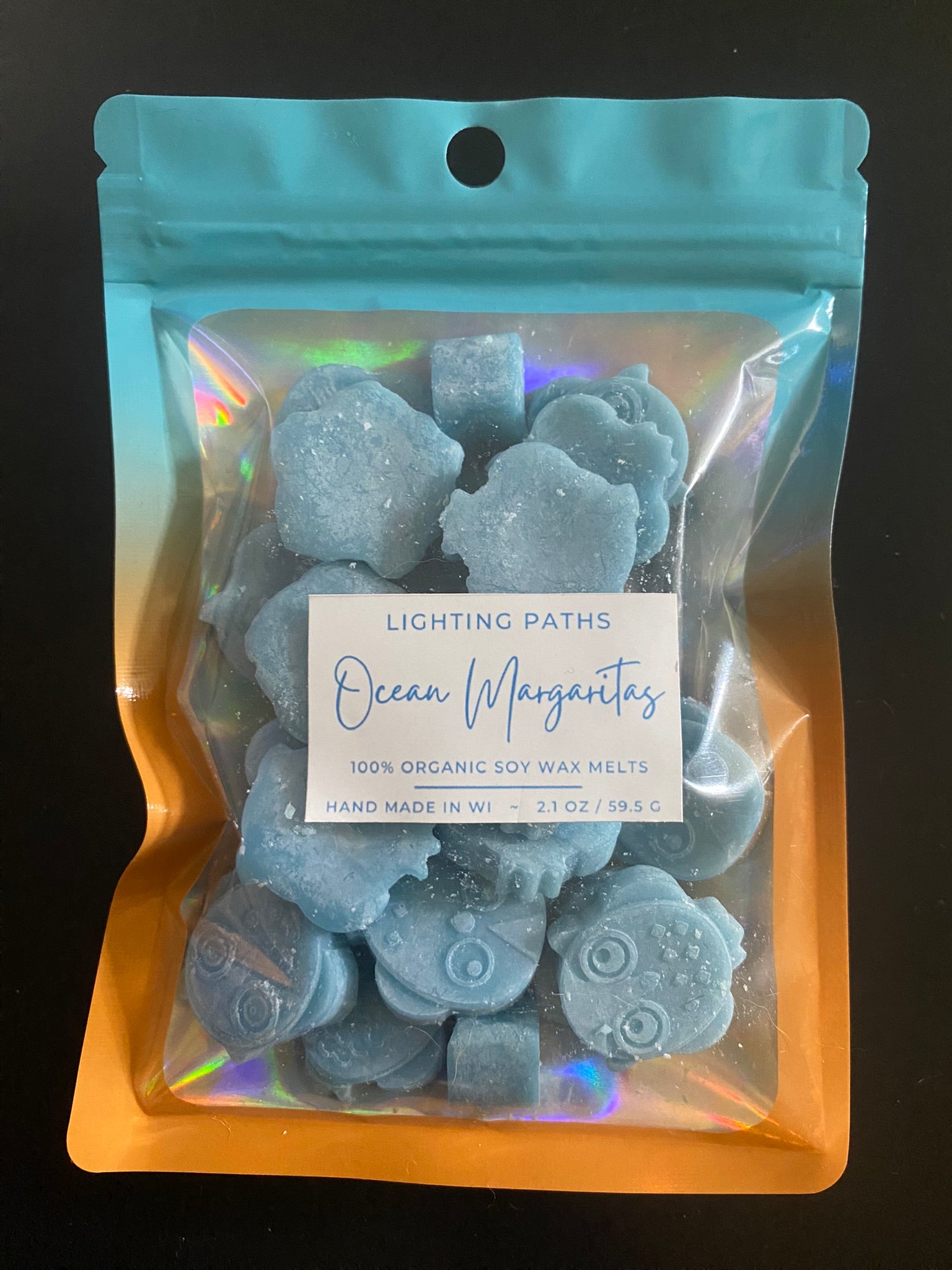 2.1 oz of shapes in a scent-locking ombre-colored bag with an iridescent clear front panel.
