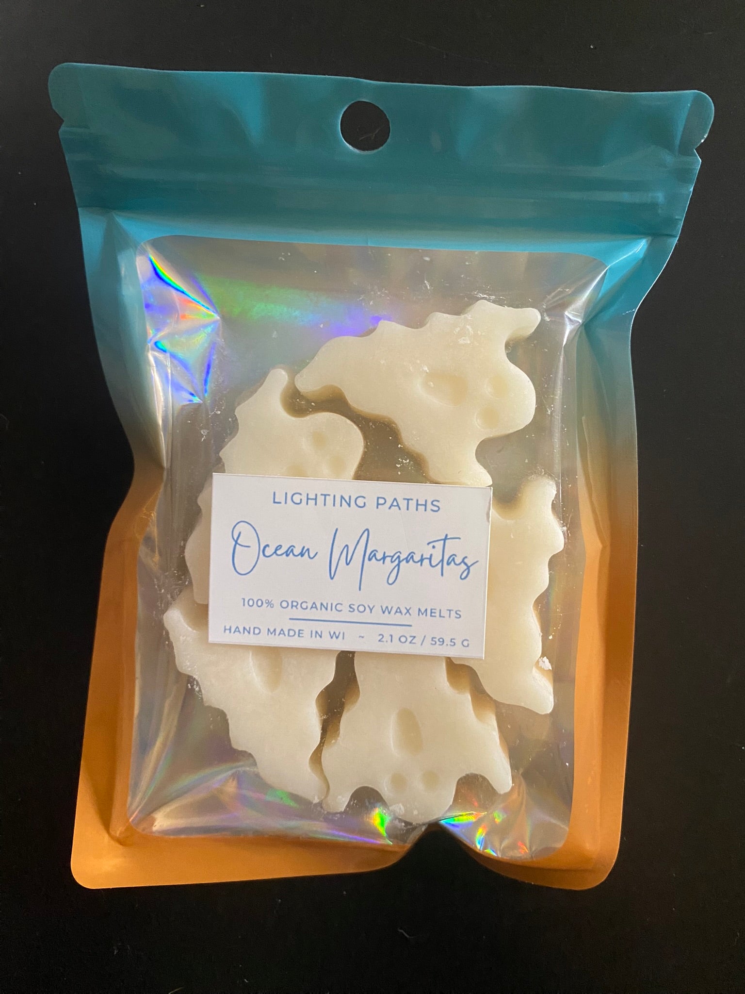 2.1 oz of shapes in a scent-locking ombre-colored bag with an iridescent clear front panel.