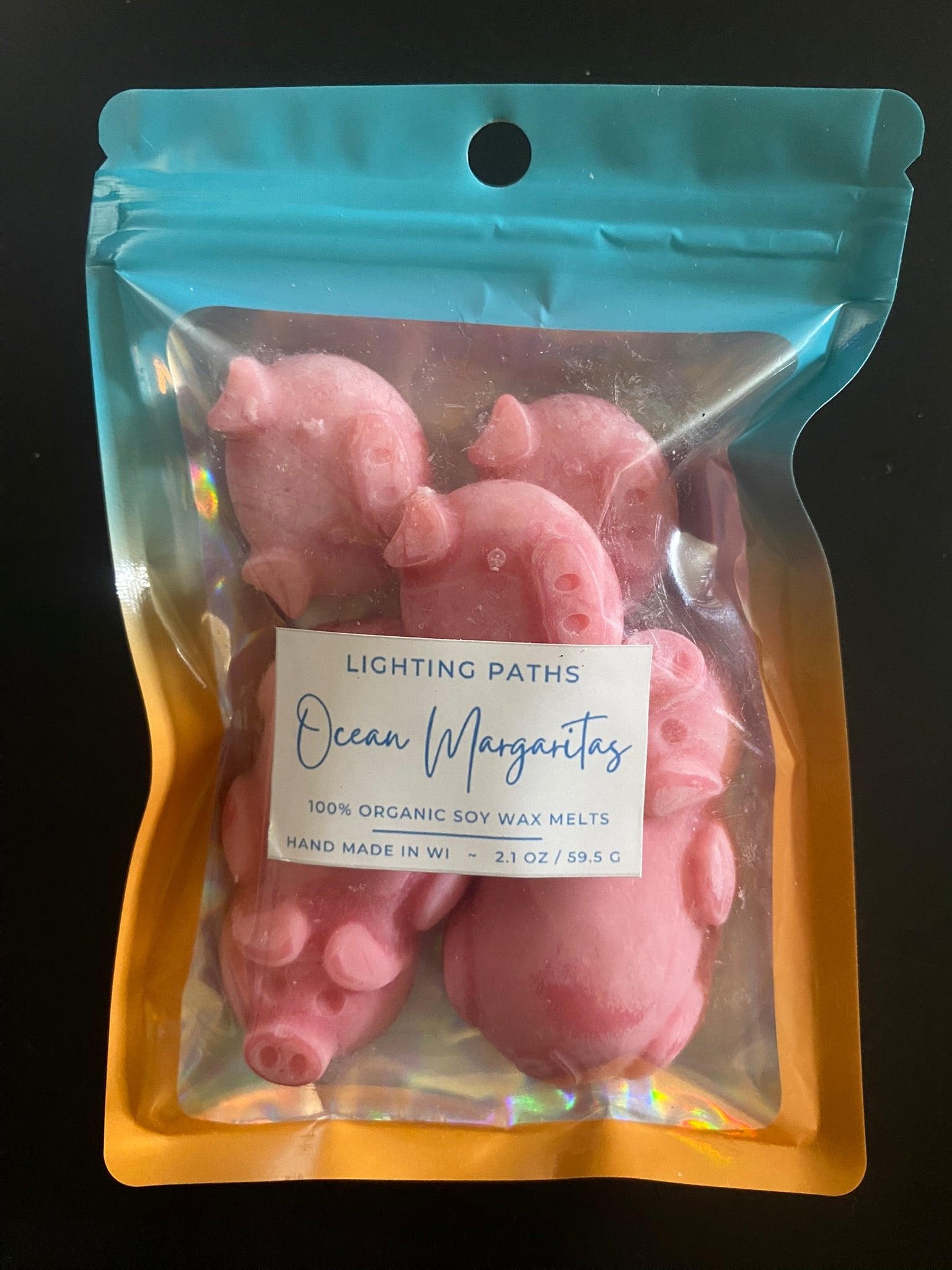 2.1 oz of shapes in a scent-locking ombre-colored bag with an iridescent clear front panel.