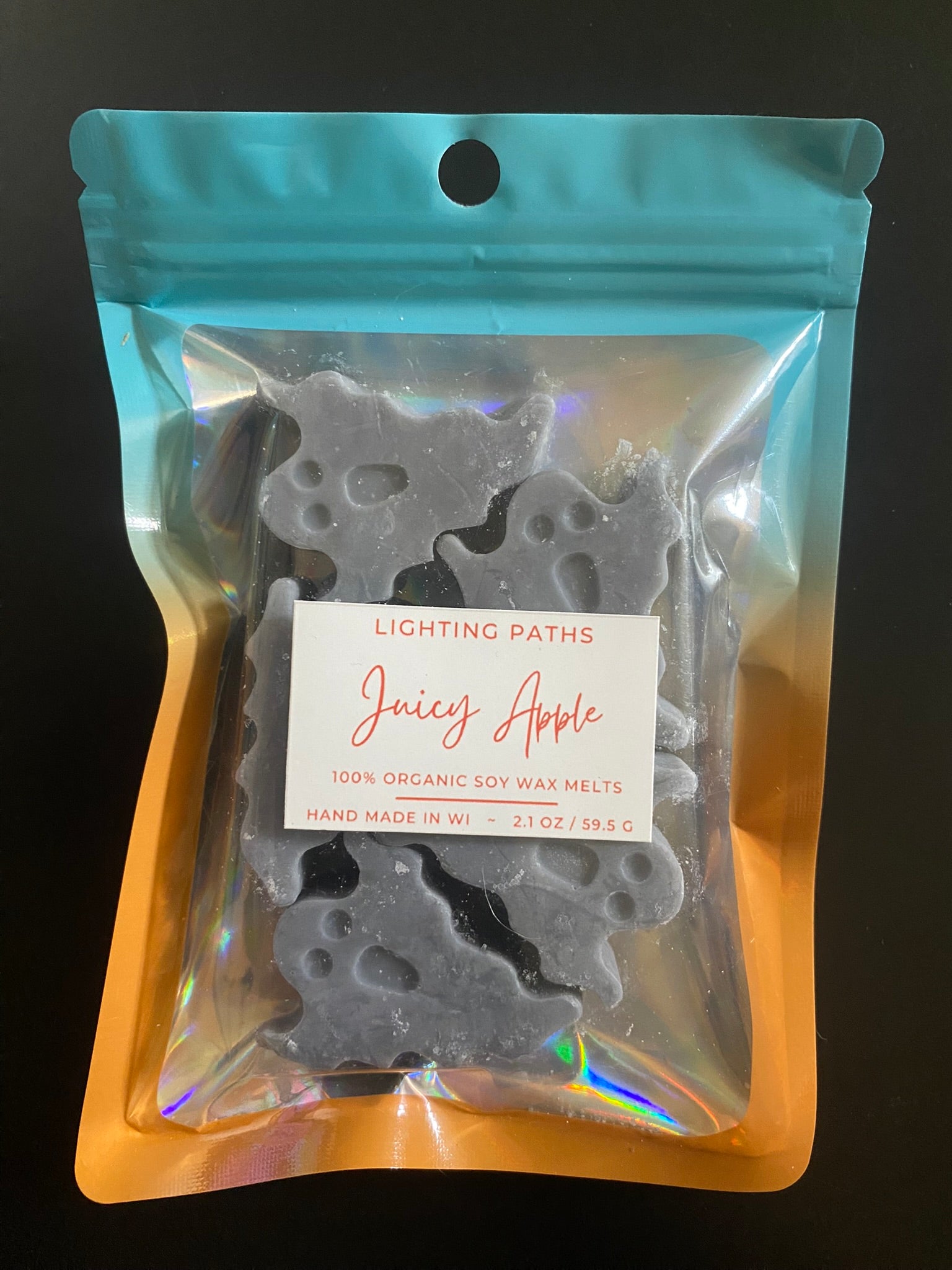 2.1 oz of shapes in a scent-locking ombre-colored bag with an iridescent clear front panel.